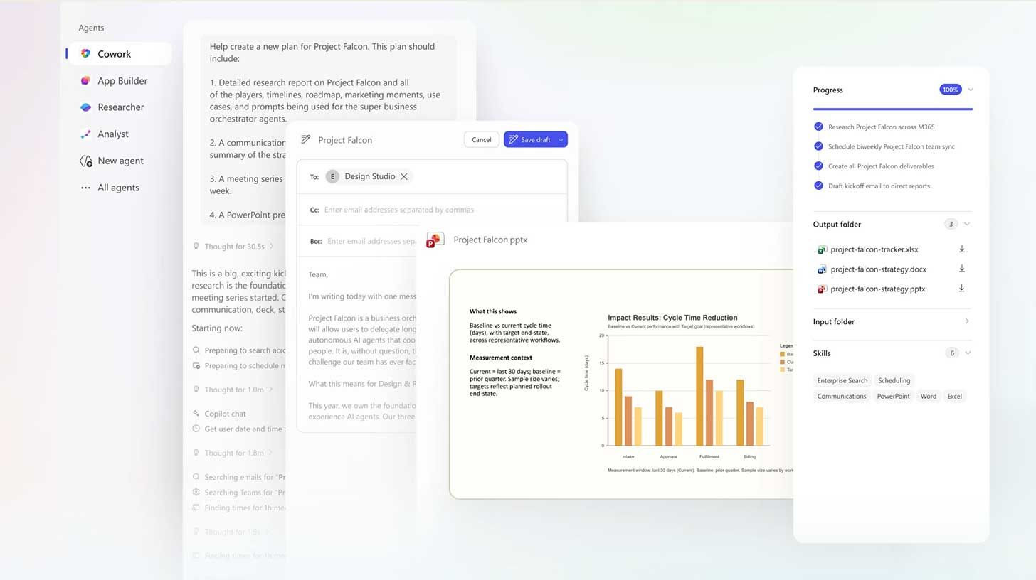 Cowork runs in the cloud and pulls context from emails, meetings, files, and chats across Microsoft 365.