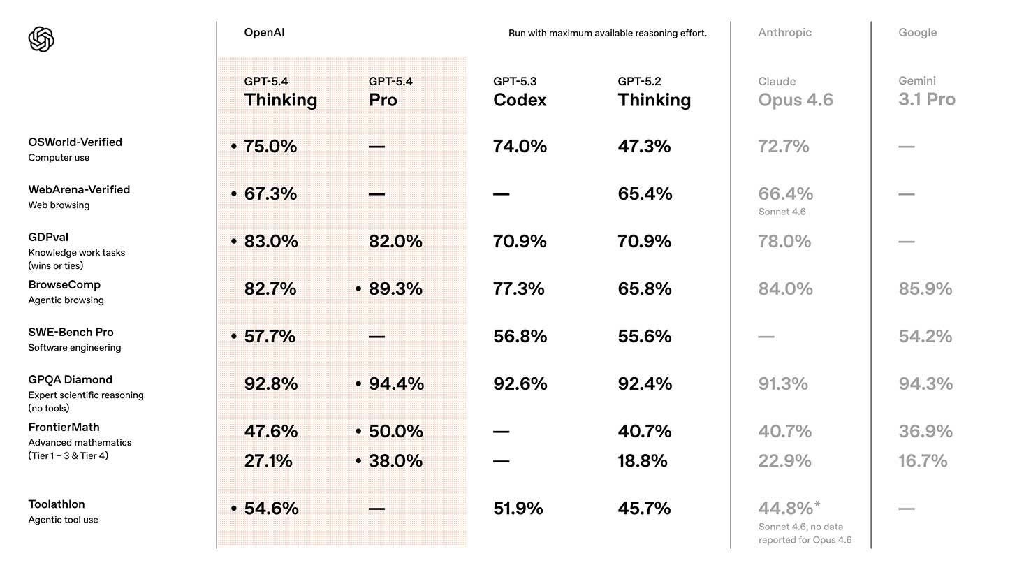 GPT-5.4 matched or beat professionals 83% of the time on the GDPval benchmark across 44 knowledge-work jobs.