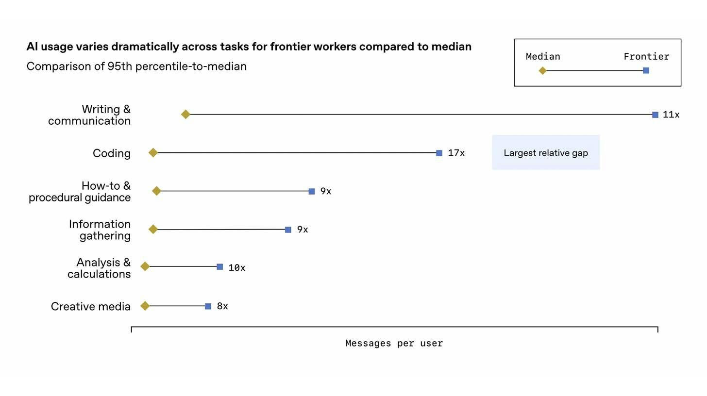 The top 5% of performers send six times more ChatGPT messages than the median; top coders show a seventeen-fold difference.