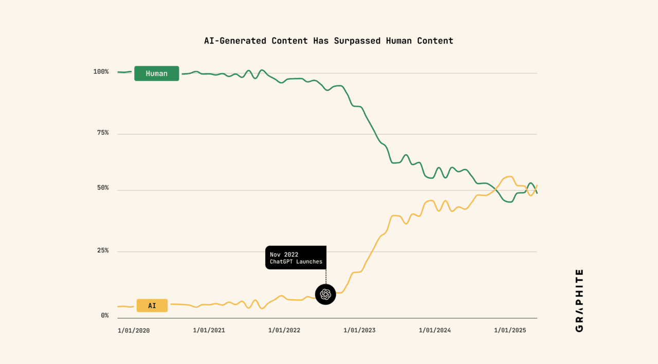 A new report from Graphite shows that after briefly overtaking human authors in late 2024, AI-generated content has now plateaued, leaving the web roughly half-human, half-machine.