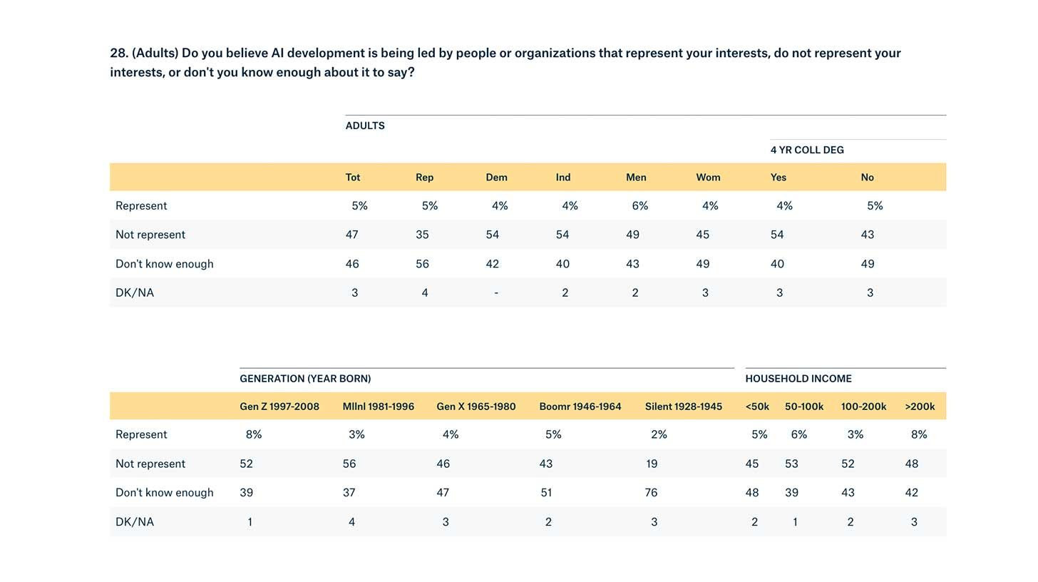 Only 5% believe AI is developed by people representing their interests, while 74% say regulation is insufficient.